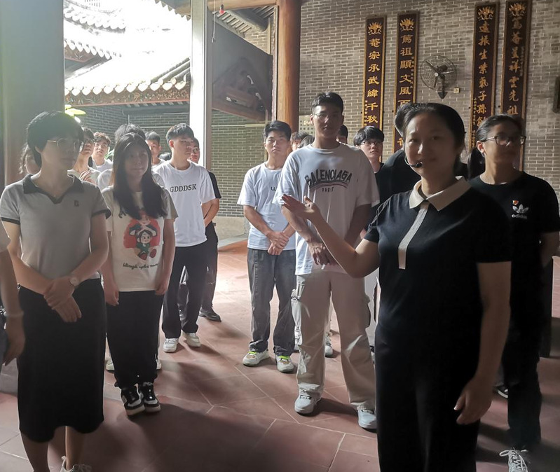 在這堂特殊的思政課中,學(xué)生們跟隨老師的步伐,一同走進(jìn)位于增城新塘鎮(zhèn)群星村的篤菴湛公祠。經(jīng)湛氏后裔湛偉健先生的介紹,湛篤菴是新塘湛氏二世祖,其父湛露為新塘湛氏的開宗始祖,其弟湛晚丁的六世孫即為湛若水。篤菴湛公祠見證了湛氏家族的歷史變遷,也承載著湛若水先生的精神遺產(chǎn)。在祠堂內(nèi),學(xué)生們認(rèn)真聆聽湛偉健先生講述湛氏家族的歷史故事,了解了新塘湛氏的起源、二世祖篤菴公的事跡,以及三世祖湛懷德保衛(wèi)鄉(xiāng)民、平息叛亂的忠義之事。隨后,另一位湛氏后裔湛柏欣先生則講述湛若水的生平事跡,了解他一生為學(xué)、為官的堅韌與執(zhí)著。