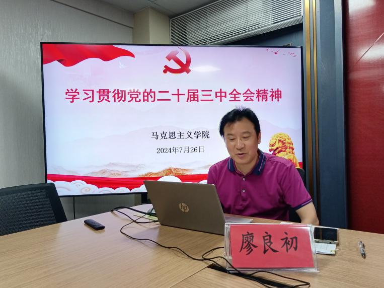為全面學(xué)習(xí)貫徹黨的二十屆三中全會精神,把全會精神第一時間融入思政課教學(xué),7月26日,馬克思主義學(xué)院組織全體思政課教師在G1棟314會議室舉行“學(xué)習(xí)貫徹黨的二十屆三中全會精神”專題講座。學(xué)院年輕學(xué)者鄭晗斐老師結(jié)合自己的學(xué)習(xí)體會,作專題輔導(dǎo),院長廖良初教授主持。