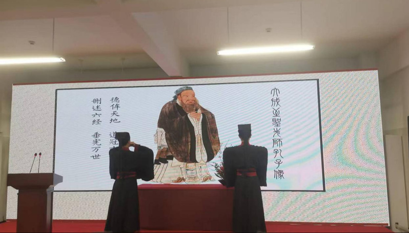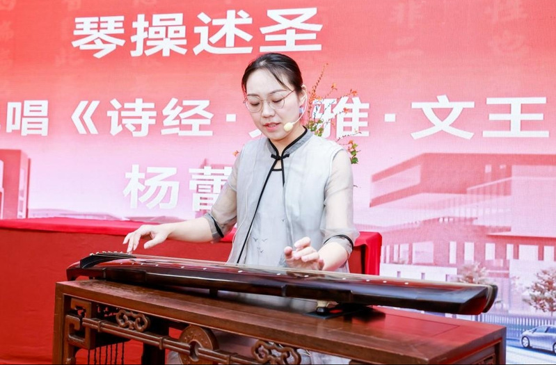 隨后,古琴廣陵派第十四代傳人、青年藝術(shù)家楊蕾演奏了《弦歌《大雅·文王》,悠揚(yáng)古樸的琴聲為活動拉開帷幕。而后,眾人一起誦讀了《史記·孔子世家贊》《中庸》里贊頌孔子的經(jīng)典文段,向孔子行敬師禮,進(jìn)獻(xiàn)素花,以此傳揚(yáng)圣人之德,表達(dá)對孔子的追慕之情。