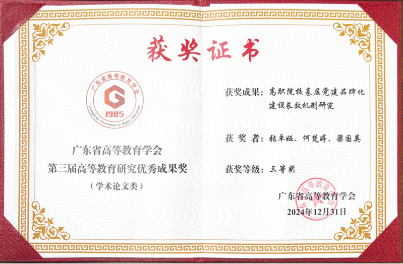 同時,論文:《高職院校基層黨建品牌化建設(shè)長效機制研究》獲廣東省高等教育學(xué)會第三屆高等教育研究優(yōu)秀成果獎三等獎。