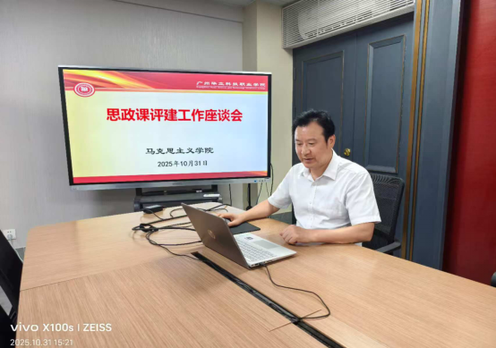 10月31日,為全面貫徹落實教育部辦公廳《關(guān)于開展2025-2026學(xué)年高校思政課課堂教學(xué)提升行動的通知》精神,堅持不懈用習(xí)近平新時代中國特色社會主義思想鑄魂育人,增強(qiáng)全體思政課教師的責(zé)任感和敬業(yè)精神,提高課堂教學(xué)質(zhì)量,馬克思主義學(xué)院在G1-314會議室召開思政課評建工作座談會。會議由廖良初院長主持。學(xué)校人事處處長鐘文浩、教務(wù)處副處長曾英姿、督導(dǎo)室主任王焰安、藝傳學(xué)院院長朱君以及全體思政課教師參加。