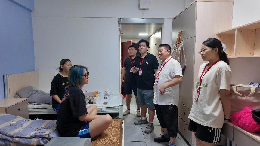 圖為中醫(yī)藥學(xué)院王暉院長與陳輝主任查看宿舍設(shè)施配置并慰問新生
