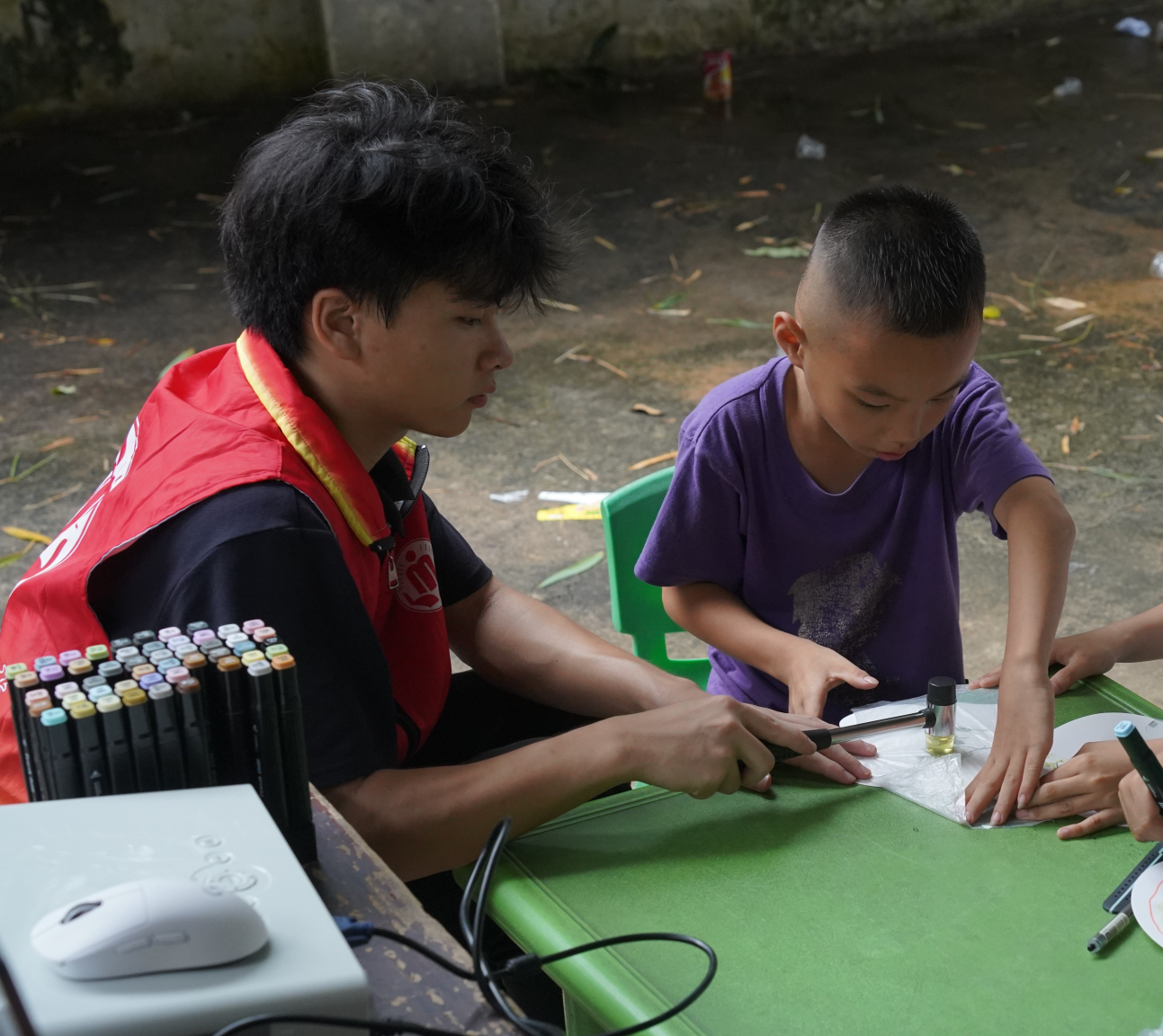 課程結(jié)束后,突擊隊員們開展了植物拓印活動,突擊隊員們帶領(lǐng)小朋友將提前處理好的植物使用橡膠錘將其汁液錘出,印在紙扇子上,并用畫筆畫上生動的圖案,制作出了富有童趣且豐富多彩的作品,現(xiàn)場氣氛熱烈,歡聲笑語此起彼伏。