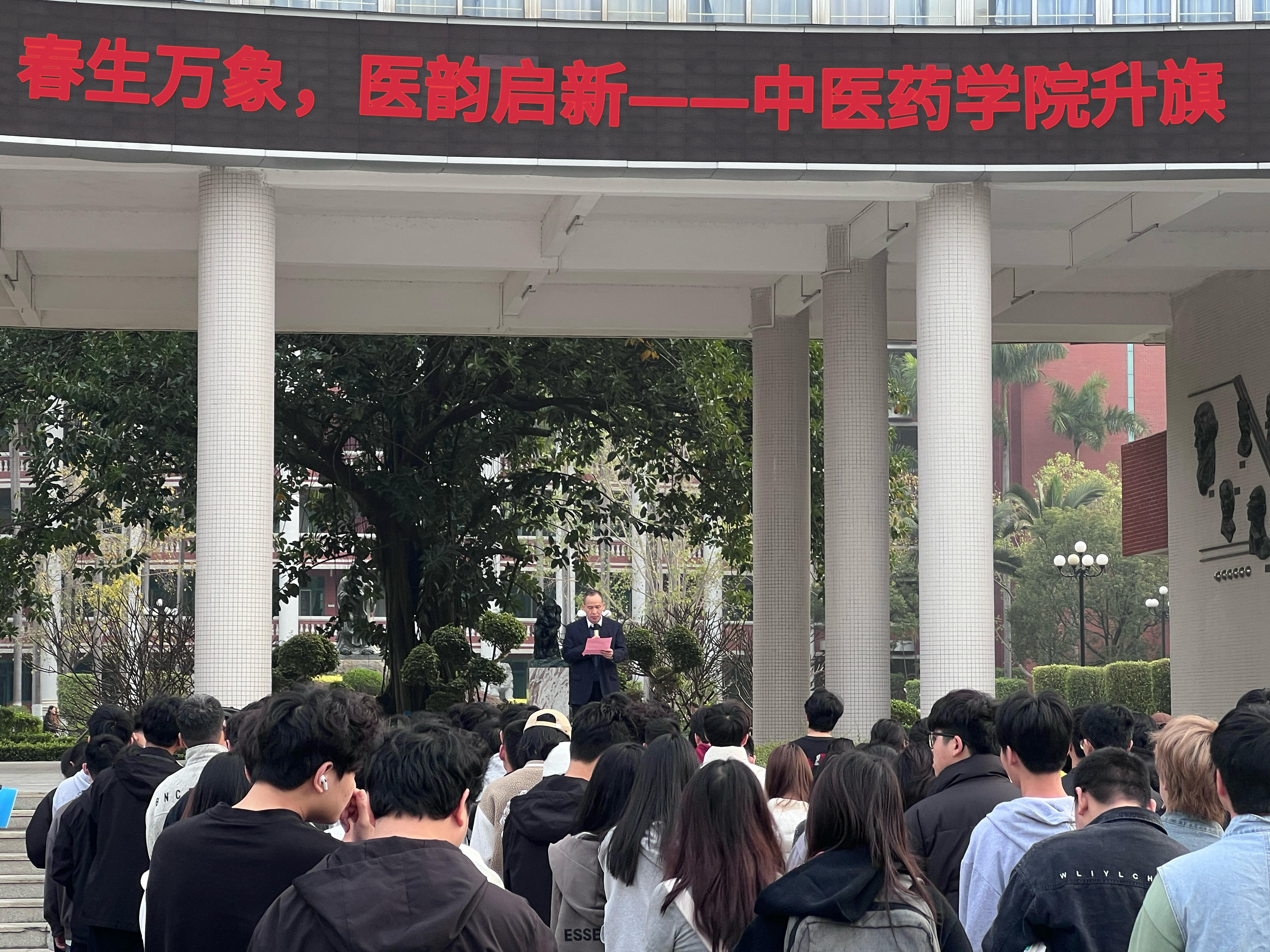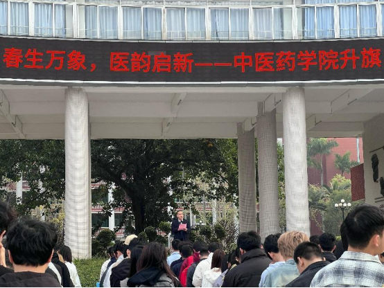 3月10日清晨,中醫(yī)藥學(xué)院全體師生齊聚校園,舉行了以 “春生萬象,醫(yī)韻啟新” 為主題的升旗儀式。出席此次活動的有:中醫(yī)藥學(xué)院院長王暉老師、中醫(yī)藥學(xué)院直屬黨支部書記、副院長曾祥彪老師、中醫(yī)藥學(xué)院直屬黨支部專職副書記、學(xué)管主任陳輝老師、24級全體輔導(dǎo)員以及中醫(yī)藥學(xué)院24級全體同學(xué)。