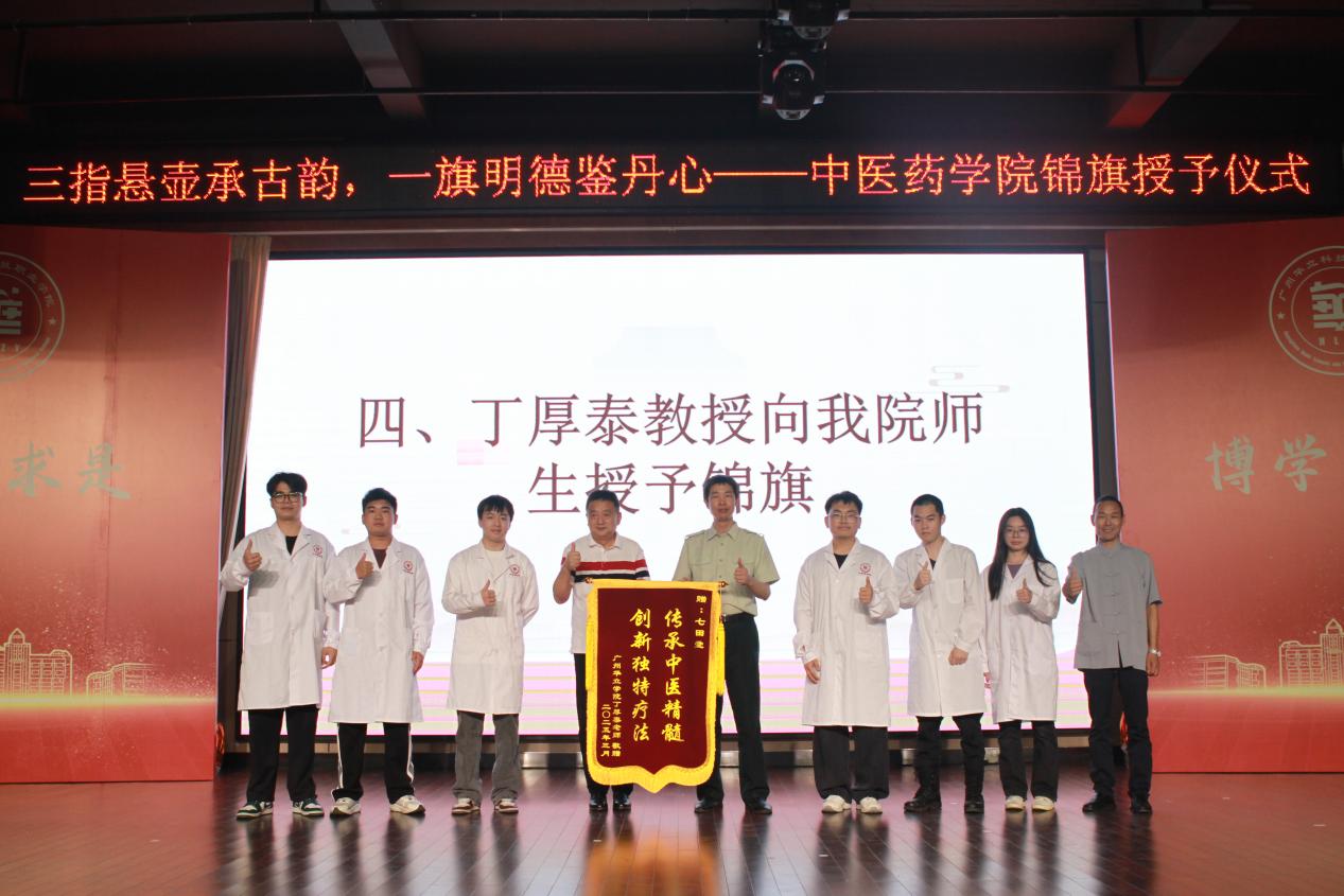 丁厚泰教授有多年腰椎頑疾,團隊成員通過中醫(yī)療法對丁教授進行調(diào)理。調(diào)理過程主要分兩期進行,采用方式為內(nèi)調(diào)外治,分別是中藥藥飲和推拿艾灸,在丁教授的積極配合下,極大地改善了困擾多年的腰椎問題。帶著一顆感恩的心,帶著從病痛折磨中獲得解放的喜悅,丁教授將一面“傳承中醫(yī)精髓,創(chuàng)新獨特療法”的錦旗,親自交到中醫(yī)藥學(xué)院師生手中,以此來感謝團隊成員的精湛醫(yī)術(shù)。這面錦旗不僅是對醫(yī)者仁心的贊譽,更是對中醫(yī)師承教育模式的生動肯定。