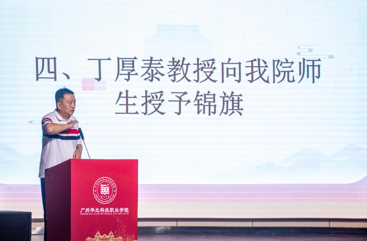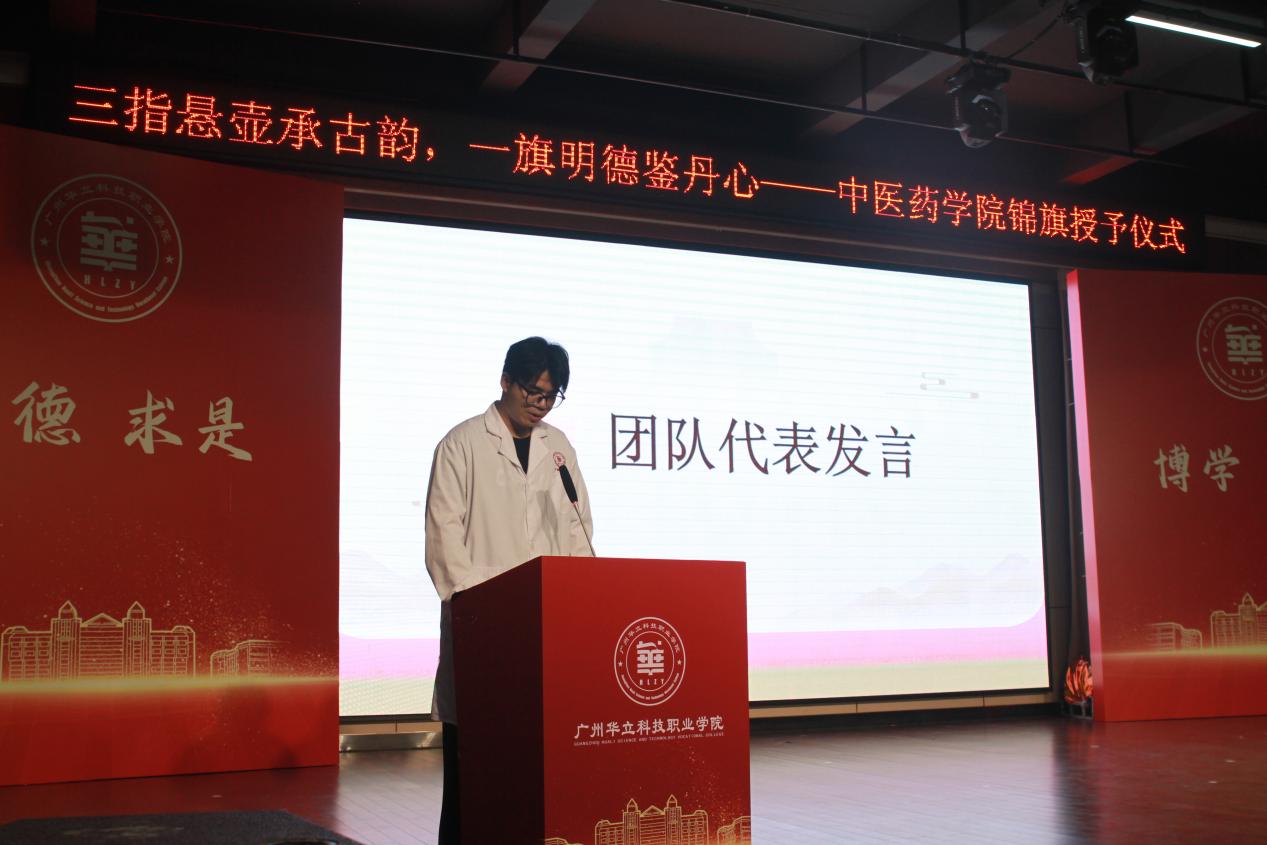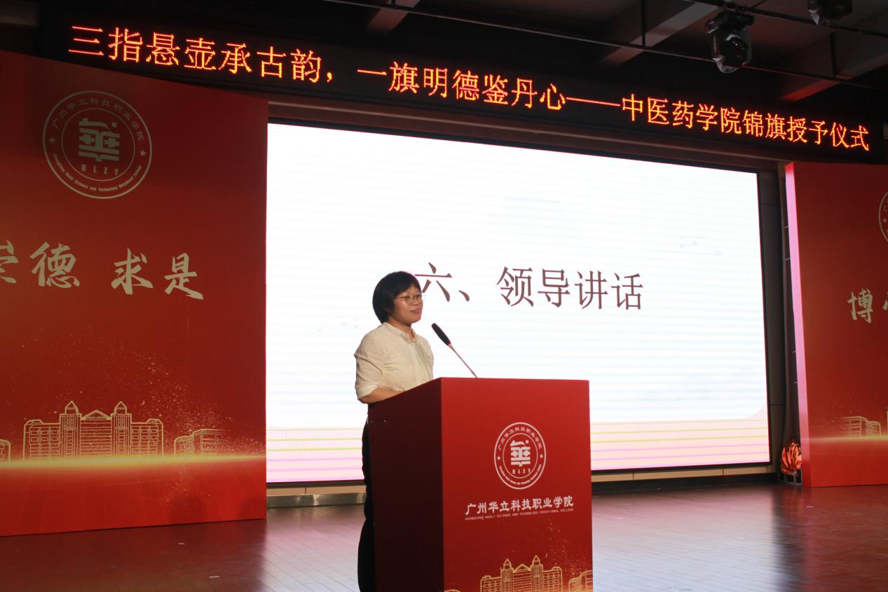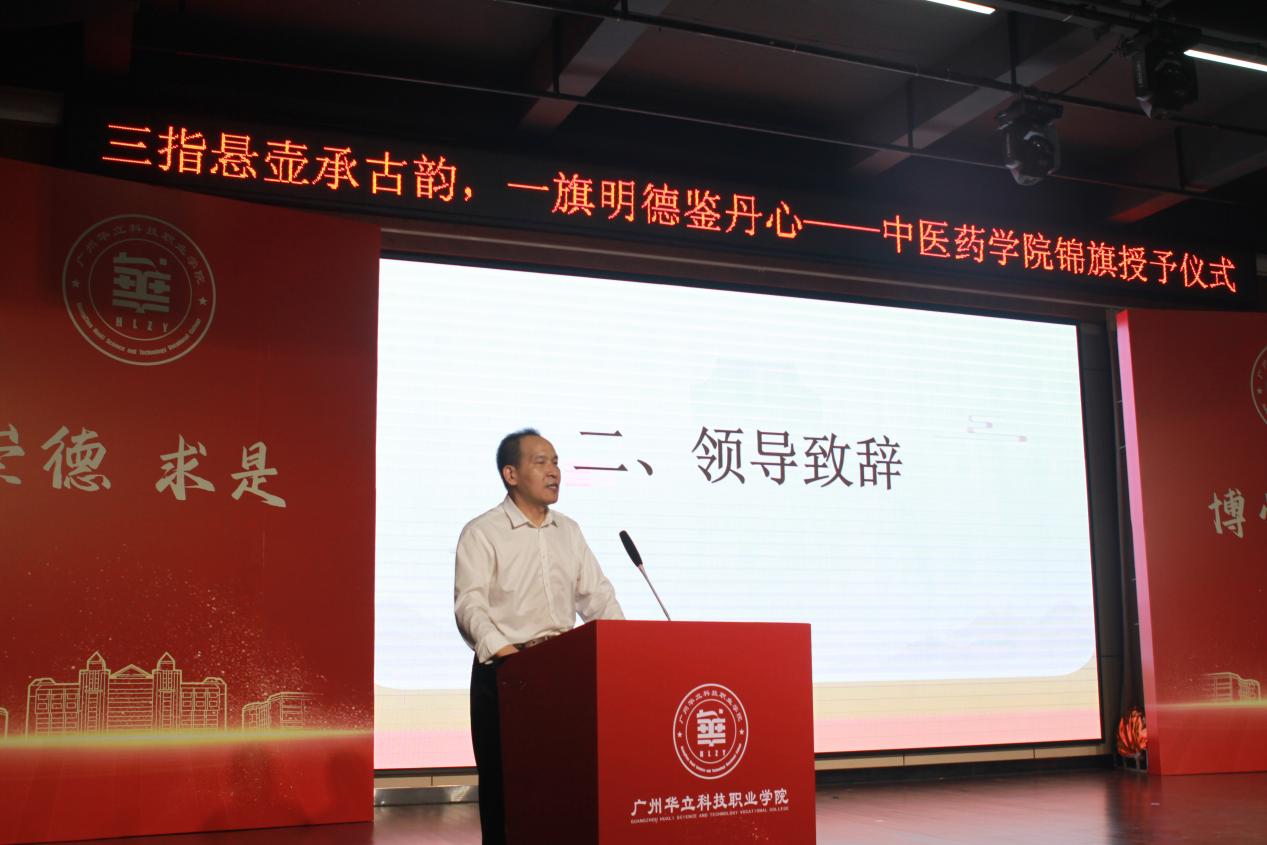 學(xué)院院長王暉首先致詞。他指出,學(xué)院目前是廣州校區(qū)學(xué)生人數(shù)最多的學(xué)院,學(xué)生的年齡差距很大,其中一些學(xué)生在入學(xué)前已從事中醫(yī)臨床工作多年,具有很豐富的實踐經(jīng)驗。有些同學(xué)還拜師學(xué)藝,身懷絕技,在某些疑難雜癥的治療方面具有獨到之處,今天的授旗活動就是這些同學(xué)展示醫(yī)技的一個典型代表。他希望,這些具有一技之長的同學(xué),積極帶動學(xué)院學(xué)風(fēng)、華立校風(fēng)建設(shè),更應(yīng)該將技能化為實際行動,服務(wù)師生,服務(wù)社會,為學(xué)院發(fā)展譜新篇!