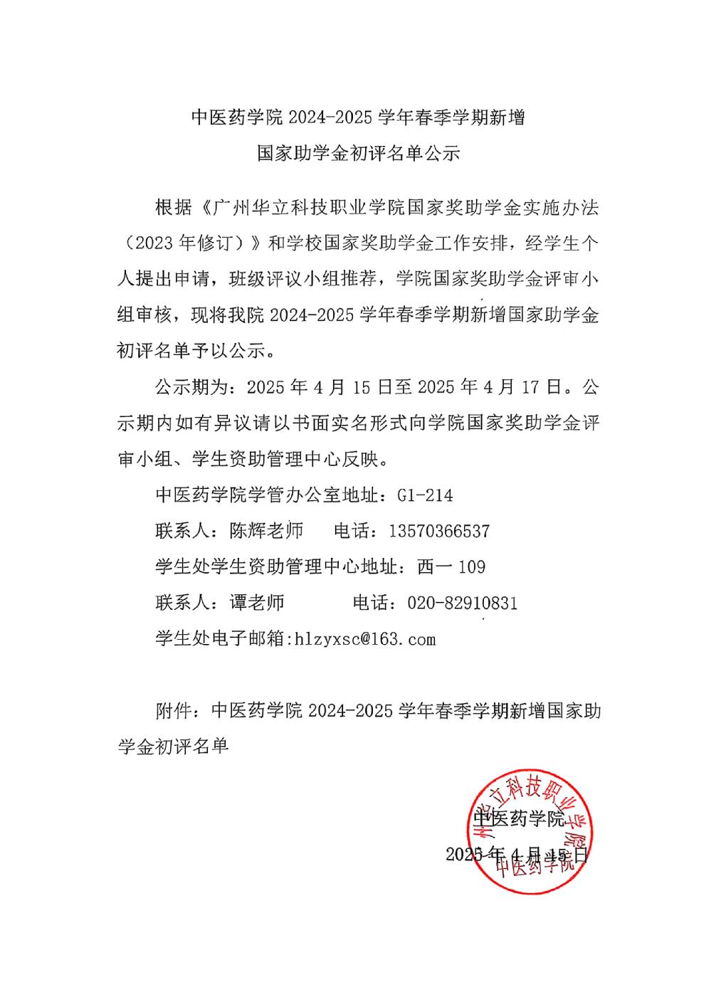 根據(jù)《廣州華立科技職業(yè)學院國家獎助學金實施辦法(2023年修訂)》和學校國家獎助學金工作安排,經學生個人提出申請,班級評議小組推薦,學院國家獎助學金評審小組審核,現(xiàn)將我院2024-2025學年春季學期新增國家助學金初評名單予以公示。
