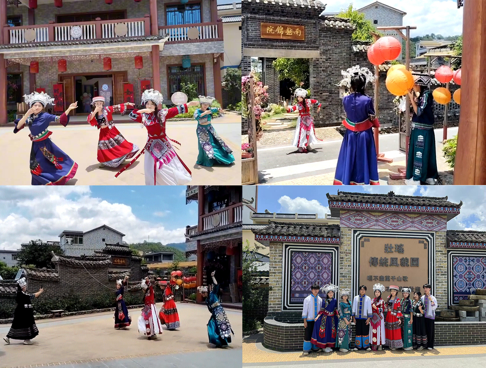 參觀結(jié)束后,隊(duì)員們迫不及待地穿上當(dāng)?shù)孛褡宸?,拍攝舞蹈視頻,讓非遺“活”起來。驕陽似火,隊(duì)員們汗流浹背,但誰都不肯停下跳舞和拍攝的腳步。大家都陶醉在火熱的民族風(fēng)情中,仿佛服飾上的每一針都是歷史,舞蹈中的每一拍都在對(duì)話山河。隨著一段段視頻拍攝發(fā)布,隊(duì)員們既為民族文化傳承注入了新的動(dòng)力,也為隱于粵西群山中的福堂鎮(zhèn)迅速“圈粉”。