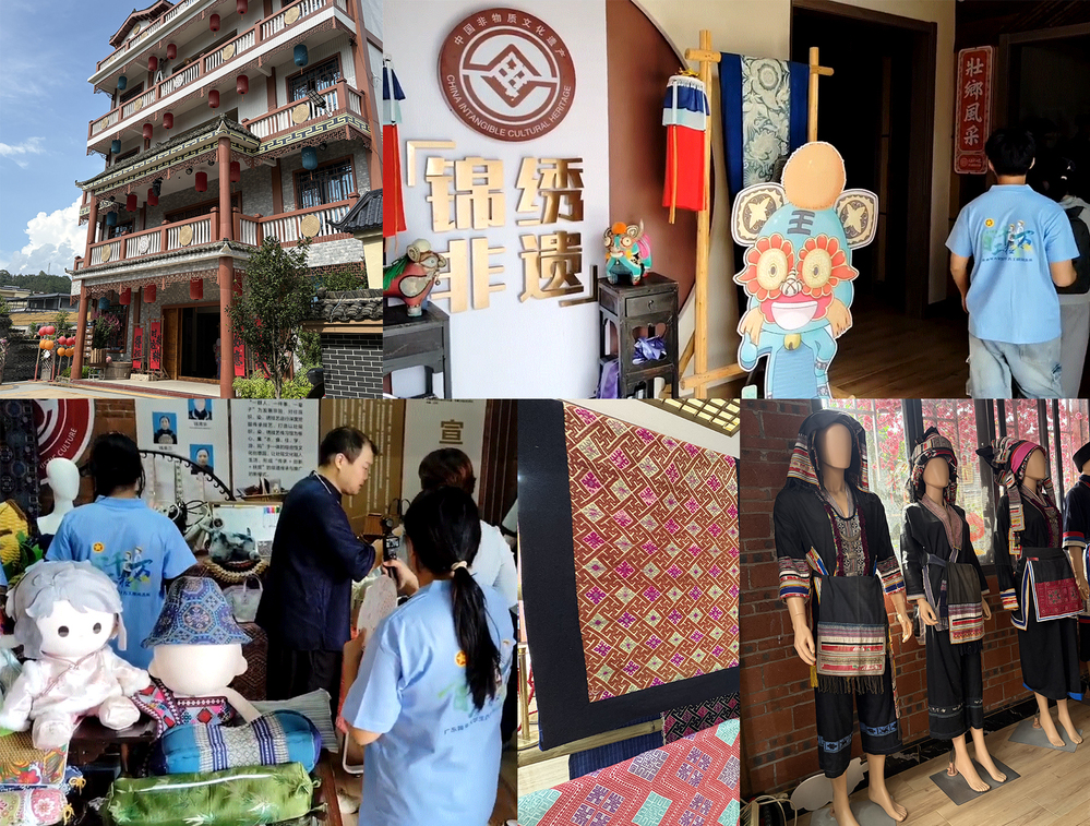 團(tuán)隊(duì)到訪福堂鎮(zhèn)的第一站就是該鎮(zhèn)的文化名片——壯瑤風(fēng)采非遺園。非遺園以金龜村老宅為基礎(chǔ),建成系統(tǒng)展示壯族紡織繡染非遺技術(shù)、民族服飾、現(xiàn)代紡織藝術(shù)品的活態(tài)博物館,2024年開園后已接待游客超30萬人次。團(tuán)隊(duì)成員置身美輪美奐的錦繡織品中,聆聽著非遺傳承人冀老師介紹多種中藥材在染料中的應(yīng)用,解讀刺繡紋樣中隱藏的族群遷徙密碼與文化象征,內(nèi)心無比神往。