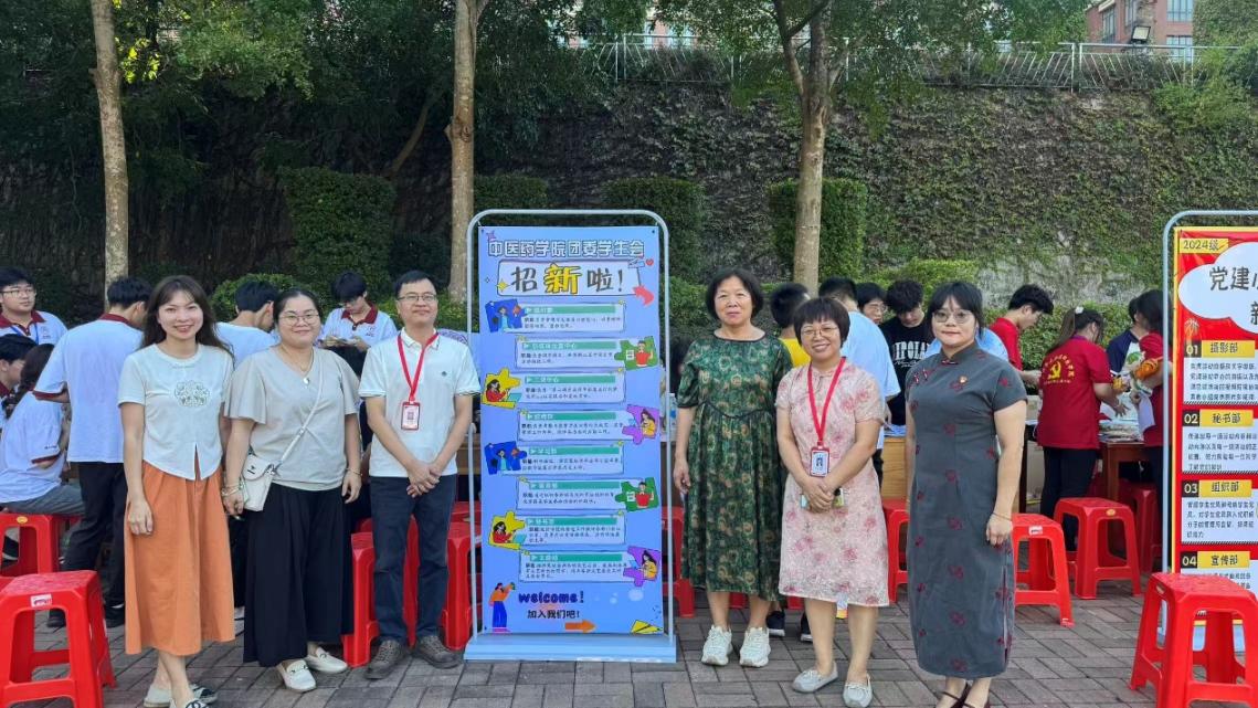 活動現(xiàn)場,招新攤位前人流涌動,學(xué)校副校長王洪艷、校辦副主任林子云、校團(tuán)委書副記宋依謎與中醫(yī)藥學(xué)院副院長張志勇、陳耀輝等老師在現(xiàn)場觀摩并指導(dǎo)招新工作。