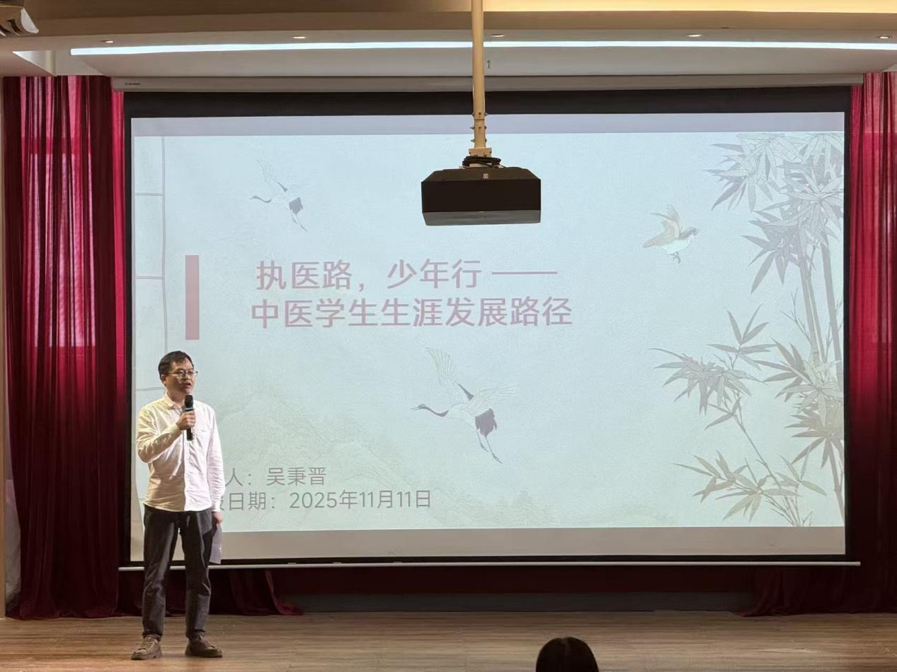 隨后,吳秉晉老師以“執(zhí)醫(yī)路,少年行”為主題開展專題分享。吳老師結(jié)合自身經(jīng)歷,從中醫(yī)藥行業(yè)就業(yè)現(xiàn)狀、職業(yè)發(fā)展方向、專業(yè)學(xué)習(xí)、升學(xué)以及考證等多個(gè)維度為同學(xué)們進(jìn)行了系統(tǒng)講解,還針對(duì)同學(xué)們普遍關(guān)心的職業(yè)選擇困惑、能力提升重點(diǎn)等問題給出了具體建議。