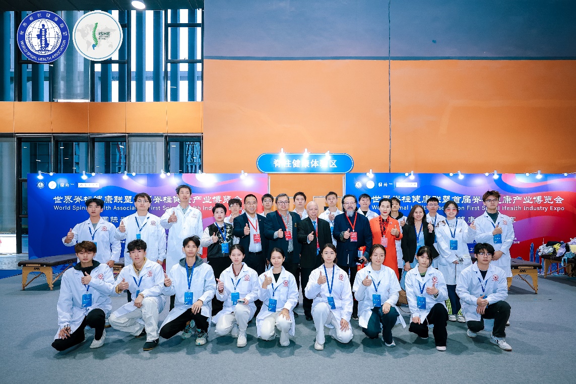 早上8:30,表演隊(duì)剛到達(dá)會(huì)場(chǎng)1樓的脊柱健康體驗(yàn)區(qū),潘菽弢博士就組織同學(xué)們列隊(duì)排練,適逢第三屆國醫(yī)大師、中國中醫(yī)科學(xué)院學(xué)部委員、正骨整脊界泰斗韋貴康教授一行蒞臨會(huì)場(chǎng),潘博士馬上邀請(qǐng)韋教授前來指導(dǎo)學(xué)生訓(xùn)練。韋教授欣然應(yīng)邀,勉勵(lì)同學(xué)們努力學(xué)習(xí)整脊技術(shù)、服務(wù)人民健康,并與我院師生合影留念。